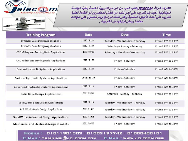 تتشرف شركة Jelecom بتقديم العديد من البرامج التدريبية الخاصة بطلبة هندسة الميكانيكية حيث يتم التدريب على أيدى نخبة من أفضل المحاضرين ذو الكفاءة العالية ويتم التدريب على أحدث الاجهزة المعملية وعلى أحدث البرامج ويتم الحصول على شهادات معتمـــــــدة ويمكن توثيقها من الخارجية