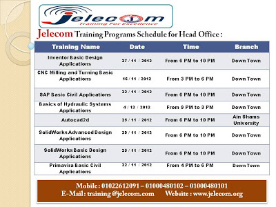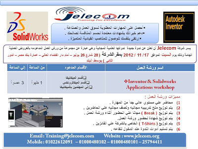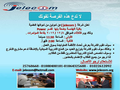 يسر شركة Jelecom أن تعلن عن ندوة جديدة ندواتها العلمية المجانية وهي عبارة عن مجموعة من ورش العمل المدعومه بالعروض العملية الهامة وذلك يوم الأربعاء الموافق14 / 11 / 2012 بمقرالشركة ( 28 شارع 26 يوليو – أمام دار القضاء العالي – عمارة بنك مصر – الدور الثاني ) بوسط البلد