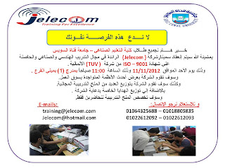 ــــبر هــــــام لجميع طـــلاب كلية التعليم الصناعي – جامعة قناة السويس بمشيئة الله سيتم إنعقاد سمينارشركة ( Jelecom) الرائدة في مجال التدريب الهندسي والصناعي والحاصلة علي شهادة ISO – 9001 من شركة ( TUV) الألمانية. وذلك يوم الأحد الموافق 11/11/2012 وذلك الساعة 11:00صباحاً بمدرج (1) بمبني الفرع