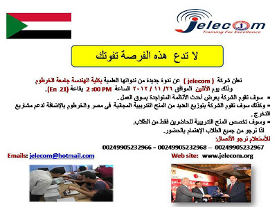يسر شركة Jelecom أن تعلن عن ندوة جديدة من ندواتها العلمية بكلية الهندسة جامعة الخرطوم وذلك يوم الأثنين الموافق 26/ 11 / 2012 الساعة 2:00 PM بقاعة (En 21).
