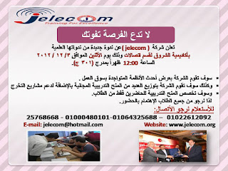 يسر شركة Jelecom أن تعلن عن ندوة جديدة ندواتها العلمية المجانية وهي عبارة عن مجموعة من ورش العمل المدعومه بالعروض العملية الهامة وذلك يوم الأربعاء الموافق 28/ 11 / 2012 بمقرالشركة ( 28 شارع 26 يوليو – أمام دار القضاء العالي – عمارة بنك مصر – الدور الثاني ) بوسط البلد