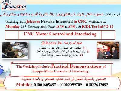 Workshop from Jelecom For who Interested in CNC Will Start on Monday 25 th February 2013 From 12 PM to 2 PM . At ICDL Test Lab *O-12